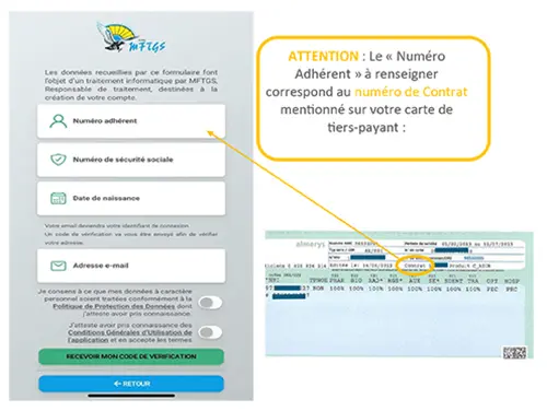 2.Cliquez sur "Créer son compte" puis remplissez les différents champs qui apparaissent à l'écran : numéro d'adhérent MFTGS (=n°de contrat sur la carte tiers payant), n° de sécurité sociale, date de naissance, adresse e-mail puis acceptez la Politique de Protection des Données et les CGU puis cliquez sur RECEVOIR MON CODE DE VERIFICATION.